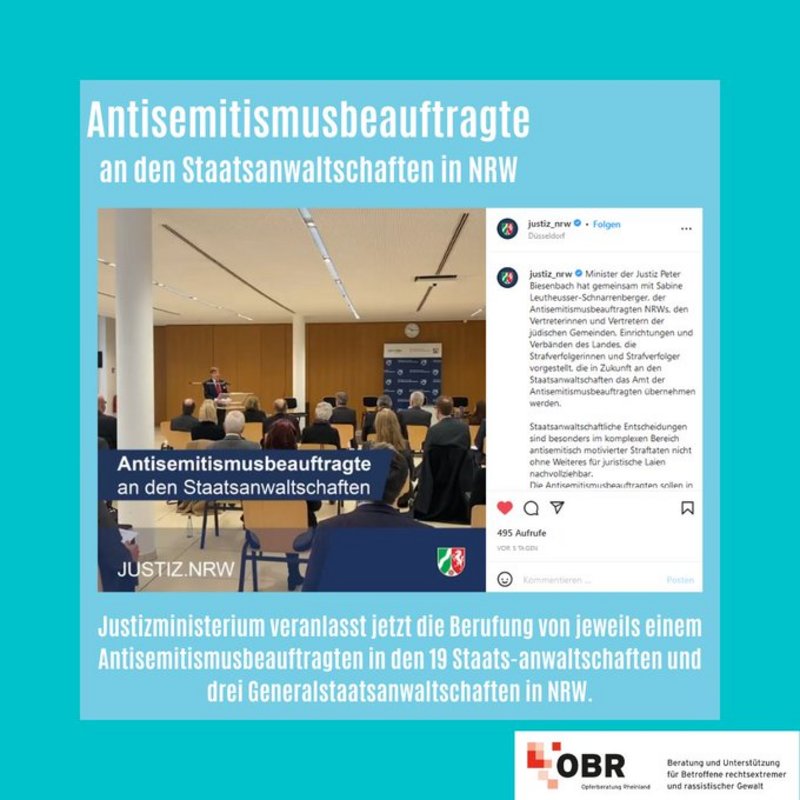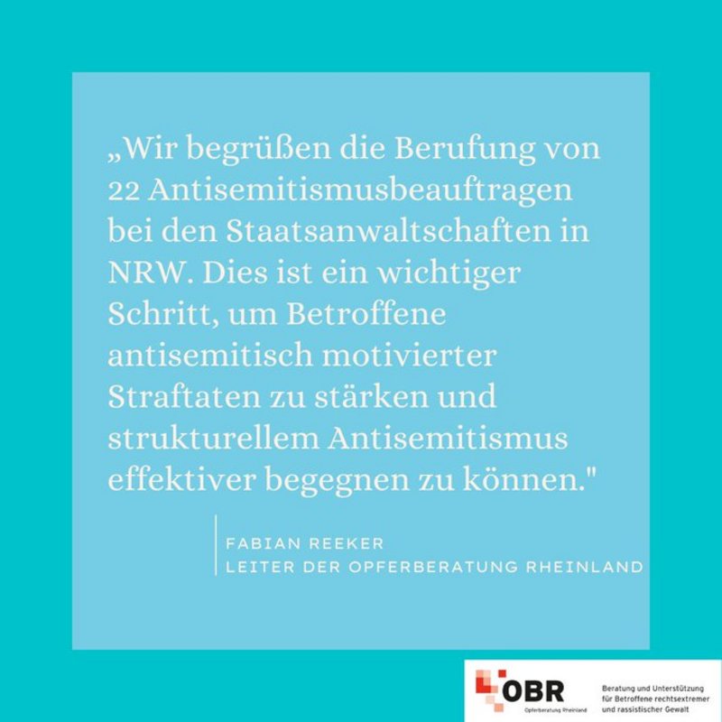 „Wir begrüßen die Berufung von 22 Antisemitismusbeauftragen bei den Staatsanwaltschaften in NRW. Dies ist ein wichtiger Schritt, um Betroffene antisemitisch motivierter Straftaten zu stärken und strukturellem Antisemitismus effektiver begegnen zu können", sagt Fabian Reeker, Leiter der OBR, zur Berufung der 22 neuen Antisemitismusbeauftragter in NRW.