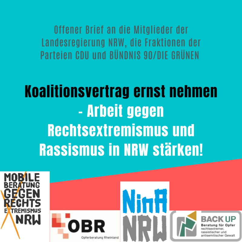 Wir, die Mobilen Beratungen gegen Rechtsextremismus in NRW, die Beratungsstellen für Betroffene rechter, rassistischer, antisemitischer und anderer menschenfeindlicher Gewalt (kurz: rechte Gewalt) BackUp und Opferberatung Rheinland (OBR), sowie die zivilgesellschaftliche Ausstiegs- und Distanzierungsberatung NinA NRW fordern die Landesregierung Nordrhein-Westfalen (NRW) sowie die Fraktionsmitglieder der Parteien CDU und BÜNDNIS 90/DIE GRÜNEN auf, ab 2023 zusätzliche Haushaltsmittel zur Stärkung der Beratungsstrukturen gegen Rechtsextremismus und Rassismus bereit zu stellen.