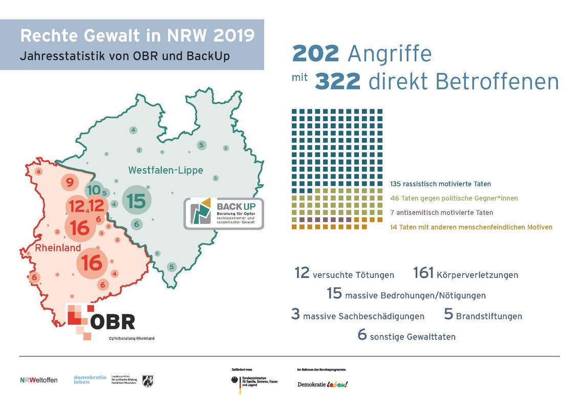 2019 gab es in Nordrhein-Westfalen (NRW) 202 rechte Gewalttaten mit mindestens 322 direkt betroffenen Menschen, darunter eine zunehmende Anzahl von Kindern. Dies ist das Ergebnis der Jahresstatistik der Opferberatung Rheinland (OBR) und BackUp, den beiden Beratungsstellen für Betroffene extrem rechter, rassistischer, antisemitischer und anderer menschenfeindlich motivierter (kurz: rechter) Gewalt.