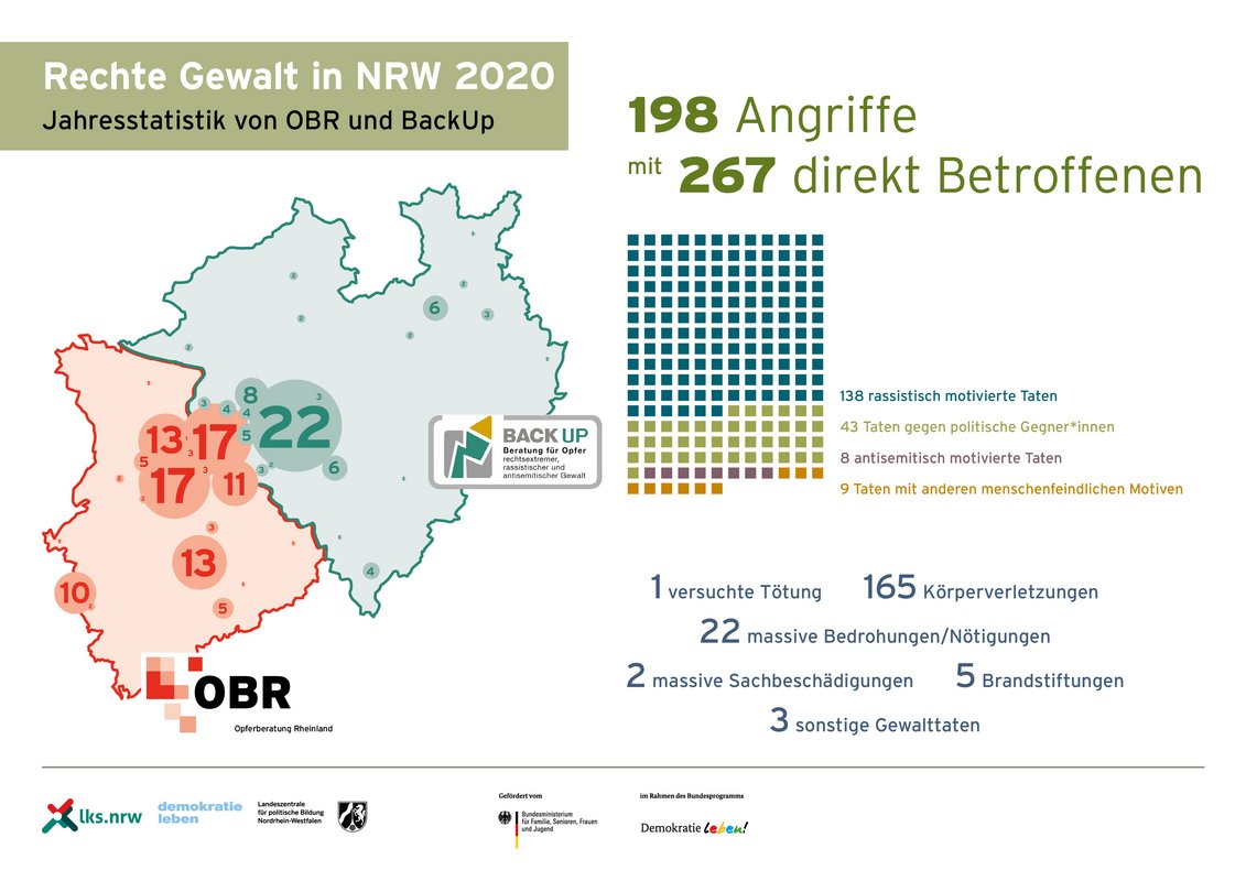 Im vergangenen Jahr wurden in Nordrhein-Westfalen (NRW) 198 rechte Gewalttaten gegen mindestens 267 direkt betroffene Menschen verübt, darunter auch Kinder und Jugendliche. Dies ist das Ergebnis der Jahresstatistik 2020 von Opferberatung Rheinland (OBR) und BackUp, den beiden Beratungsstellen für Betroffene rechter, rassistischer, antisemitischer und anderer menschenfeindlich motivierter (kurz: rechter) Gewalt in NRW.